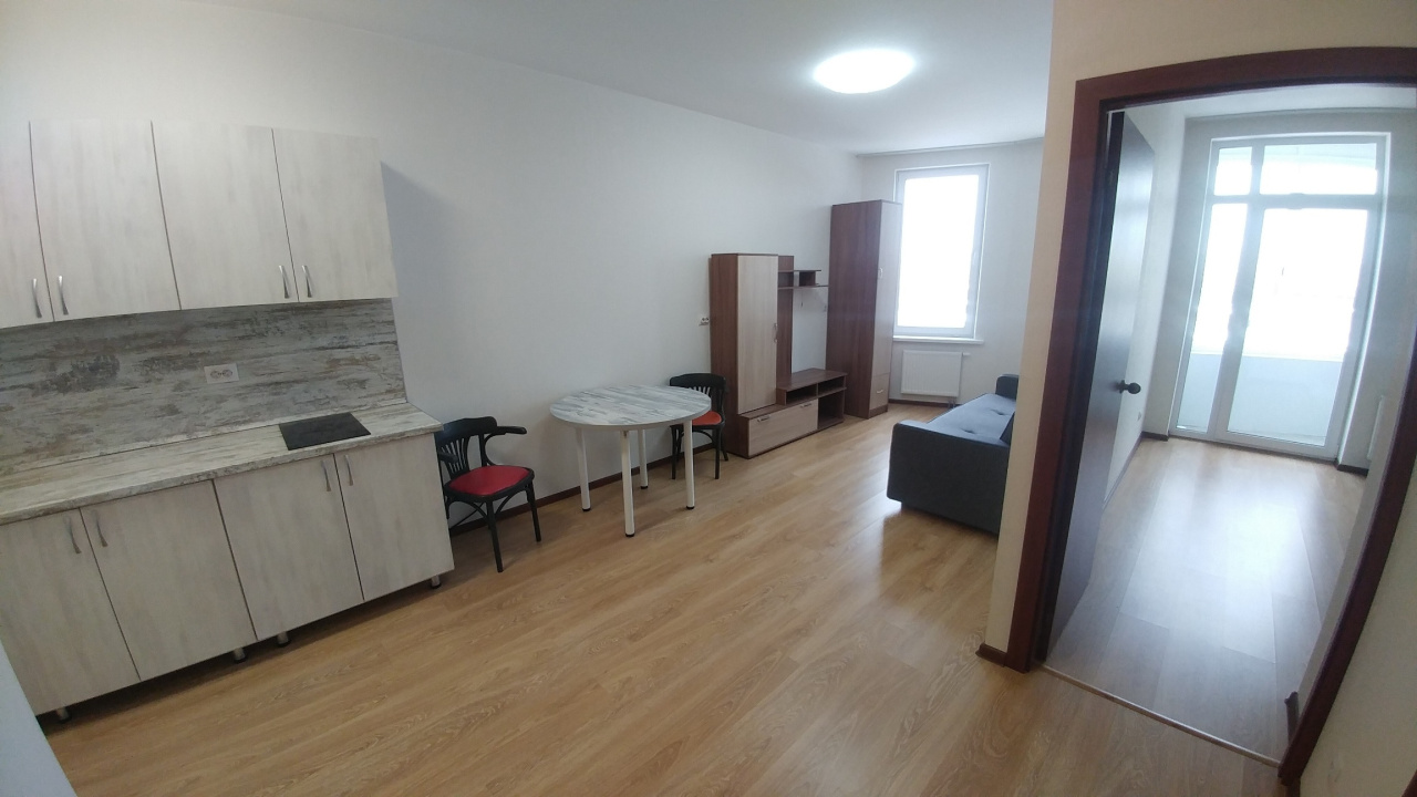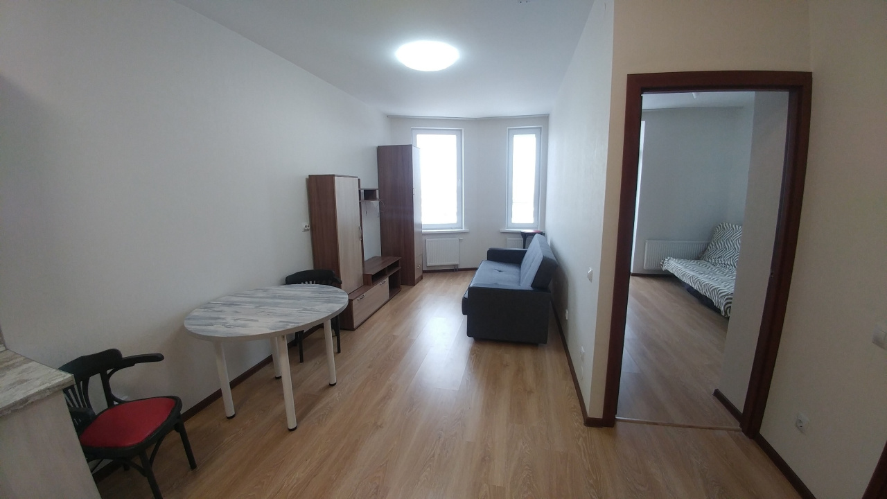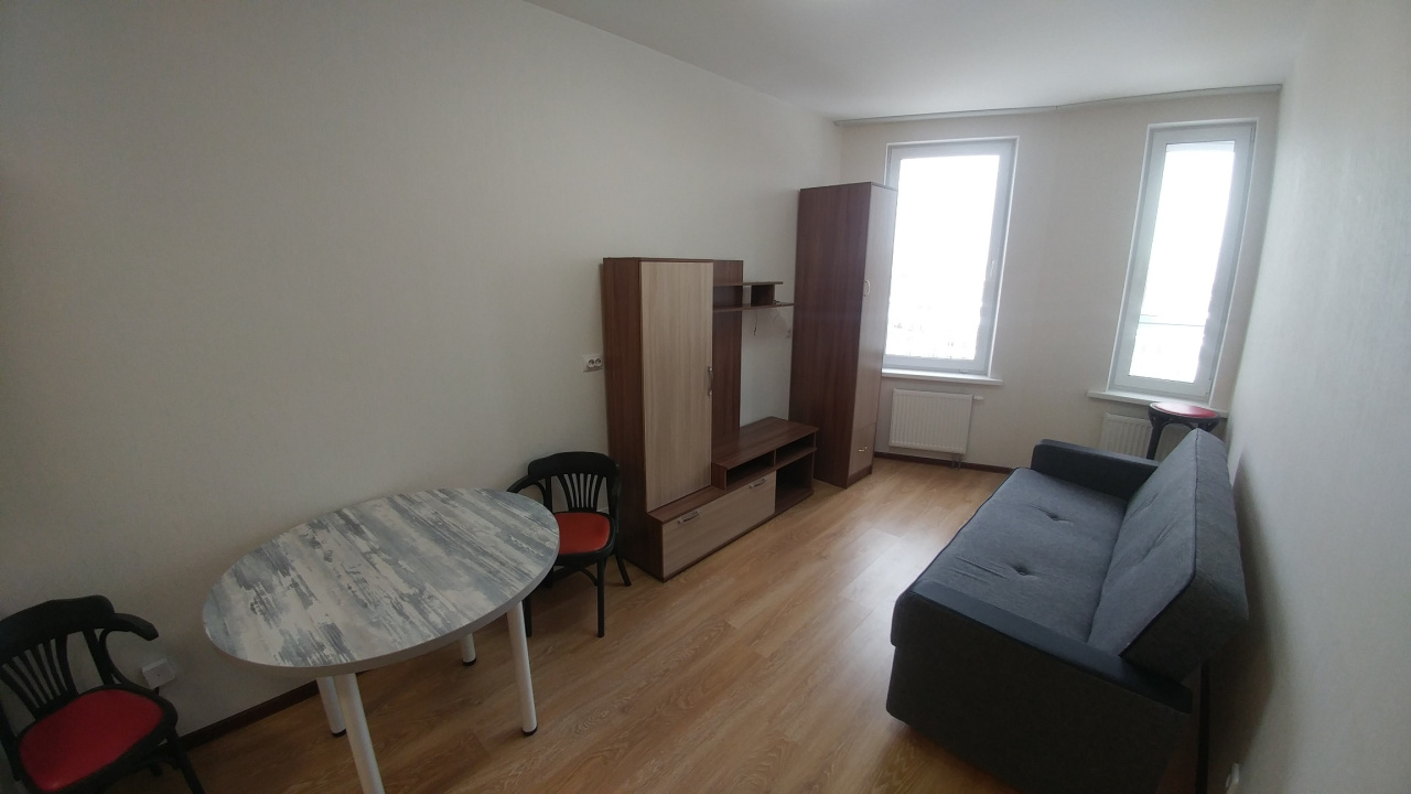 Квартира оборудована всей необходимой техникой и мебелью. Диван в студии с кухней.