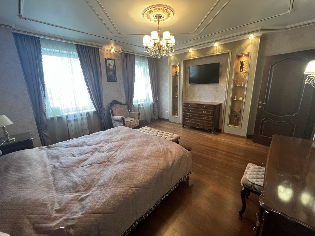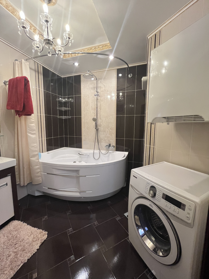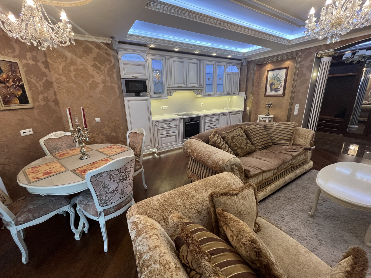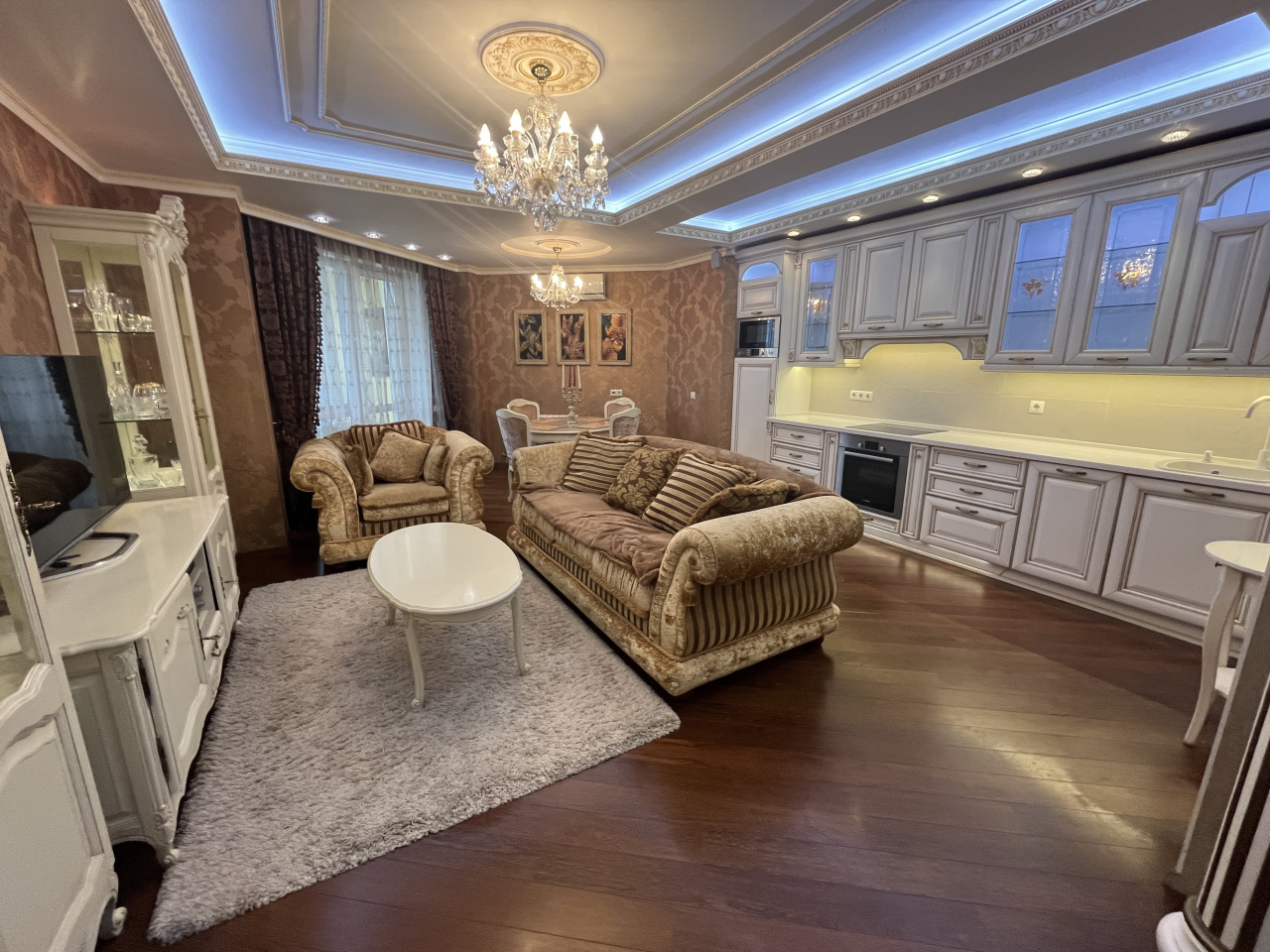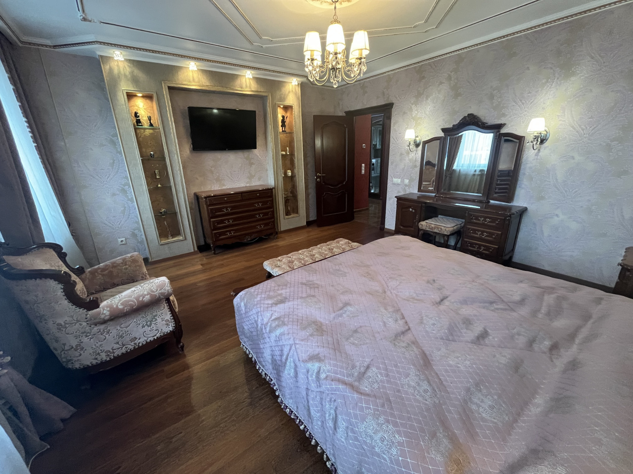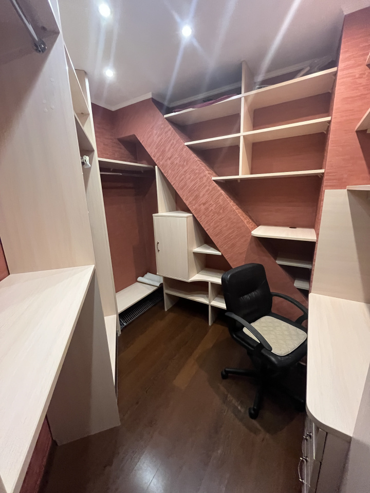 Зал совмещен с кухней, спальня отдельно. Делали для себя. В квартире сделан ремонт из дорогих материалов. Вся мебель из натурального дерева, подогревы полов, кондиционирование. Гардеробная комната. Сушка для белья, посудомойка.