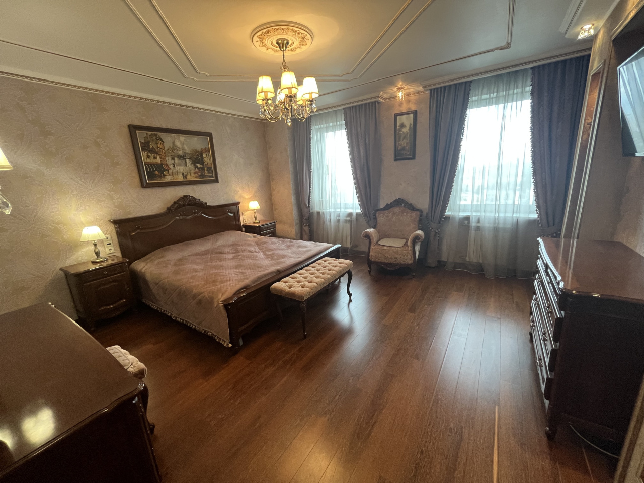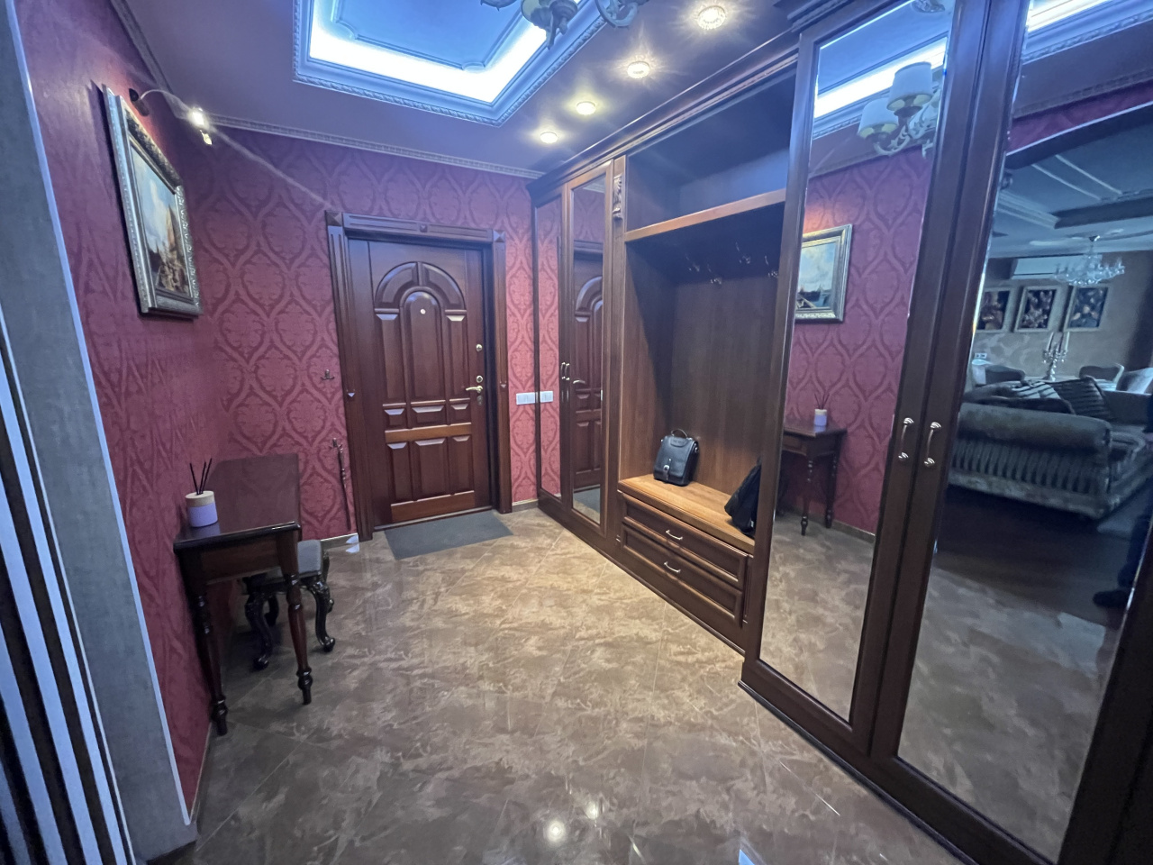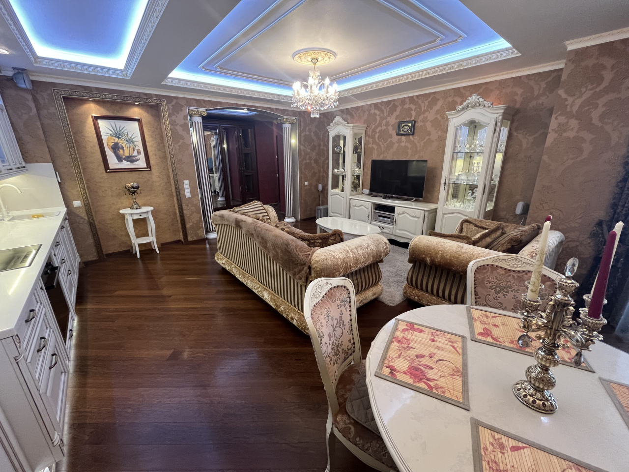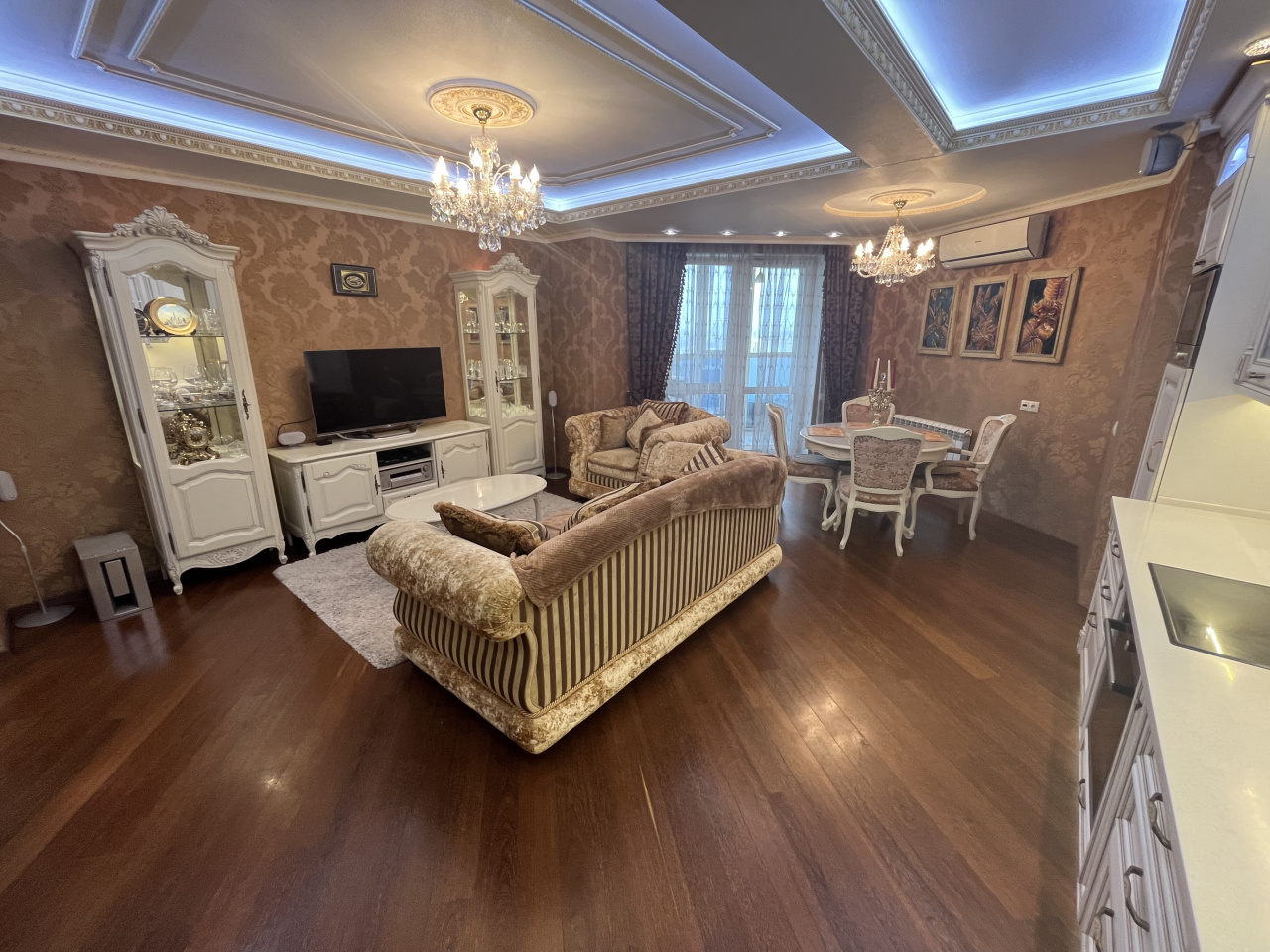 Зал совмещен с кухней, спальня отдельно. Делали для себя. В квартире сделан ремонт из дорогих материалов. Вся мебель из натурального дерева, подогревы полов, кондиционирование. Гардеробная комната. Сушка для белья, посудомойка.