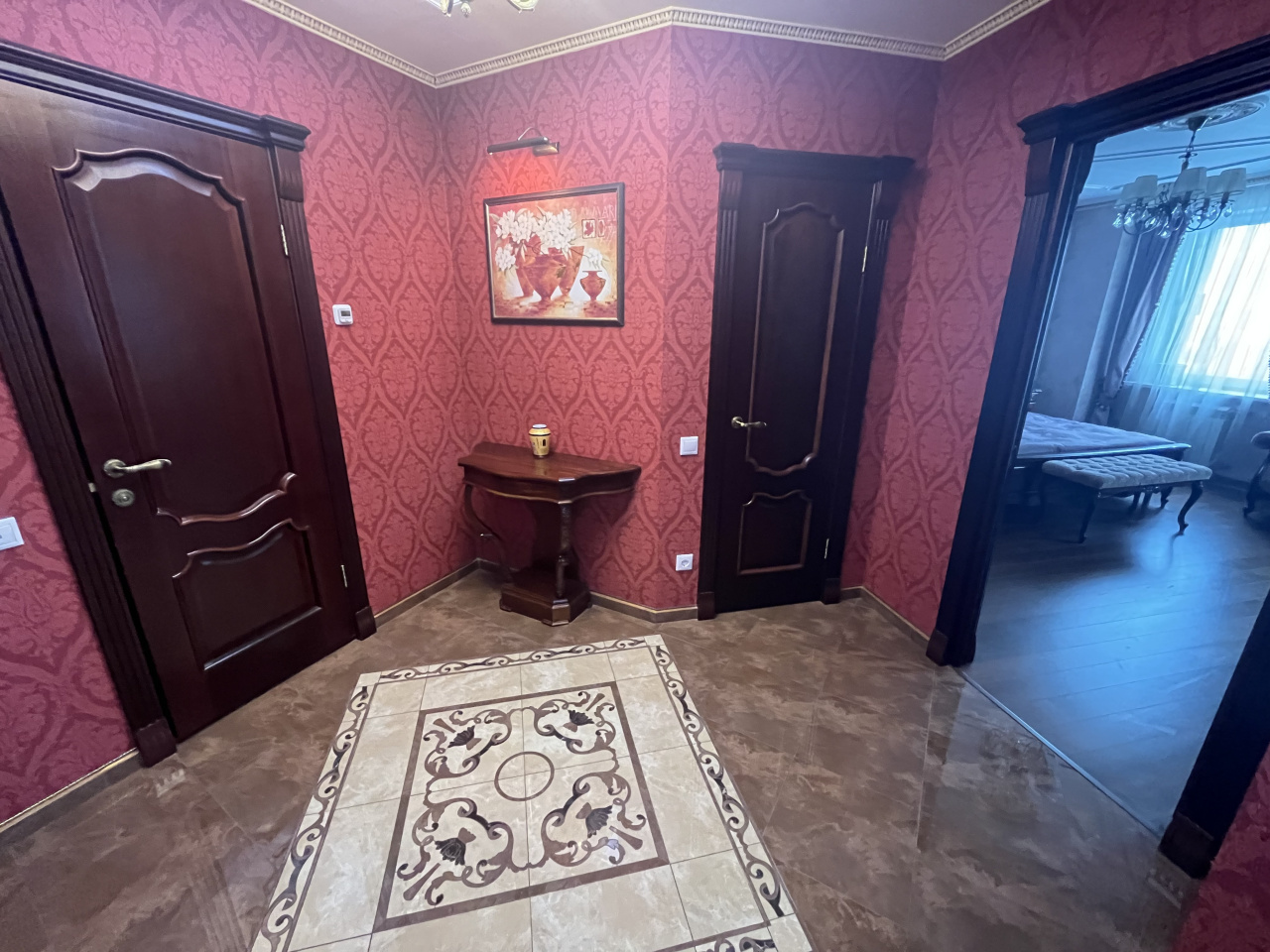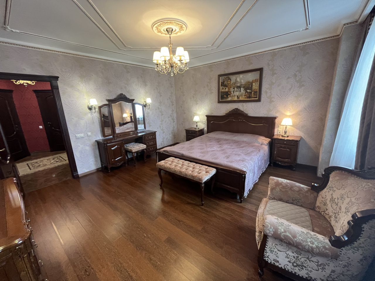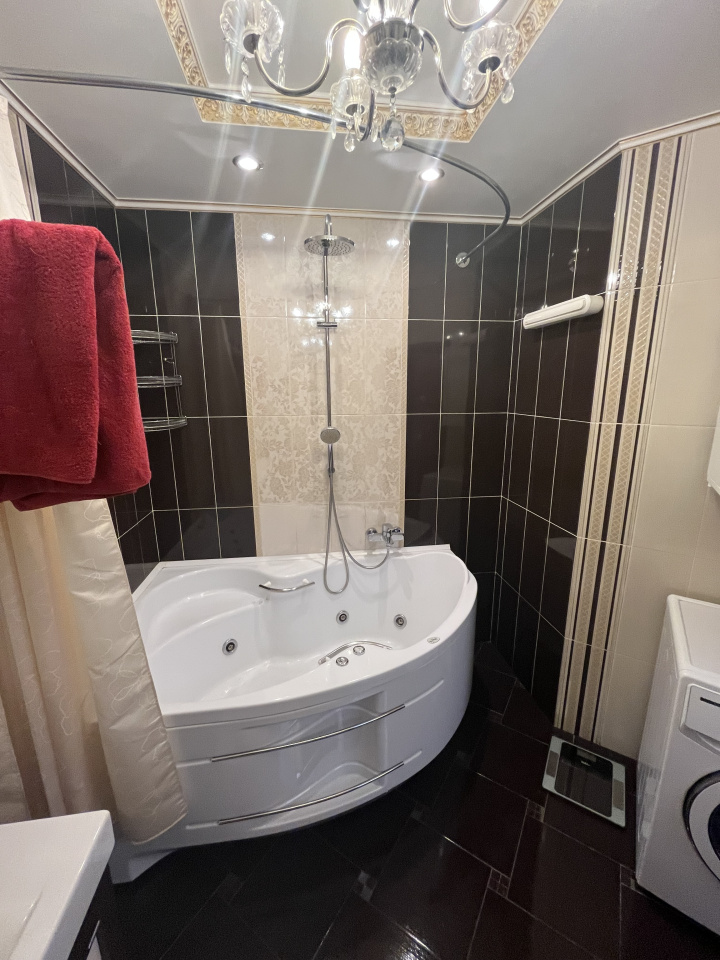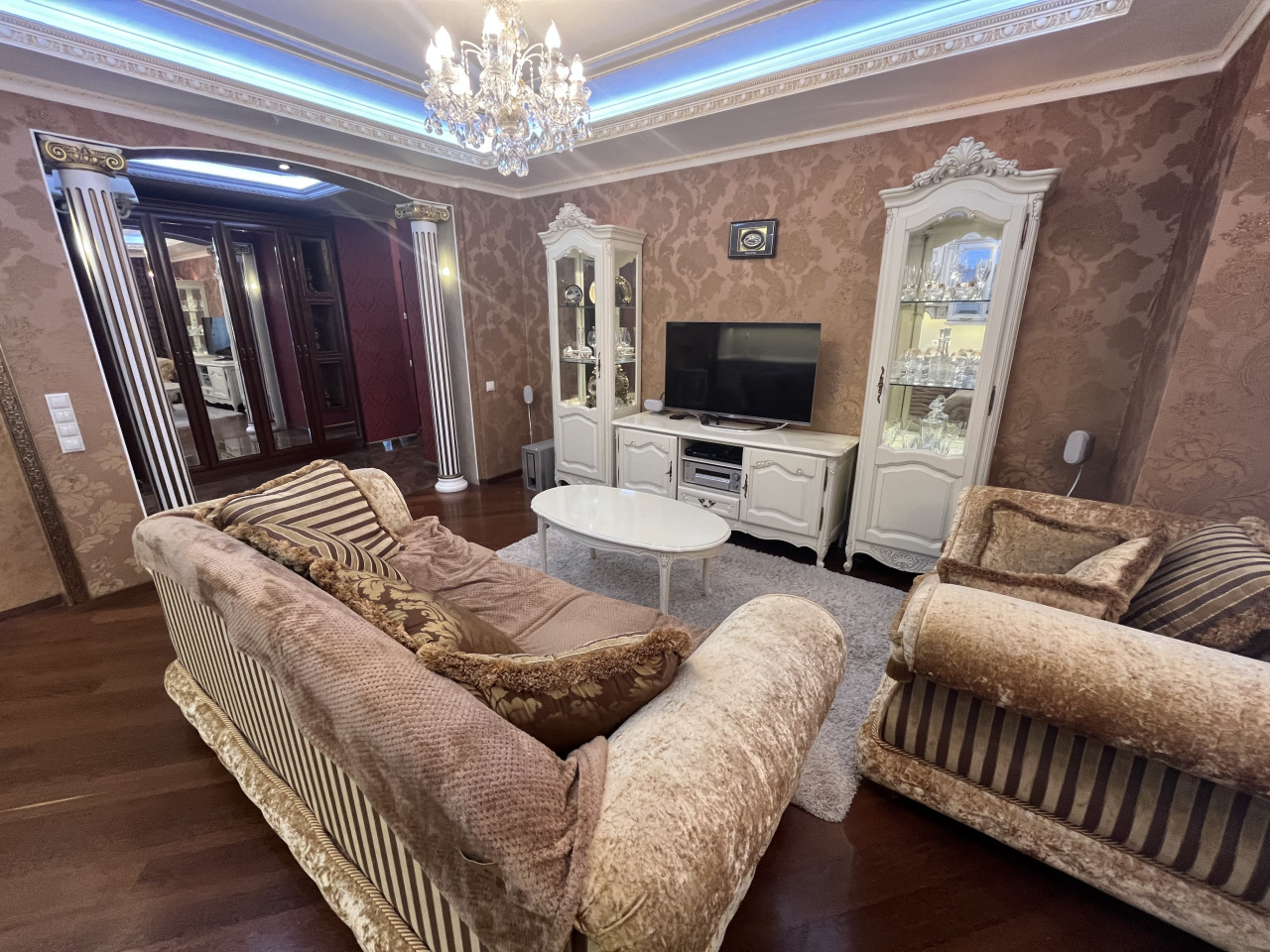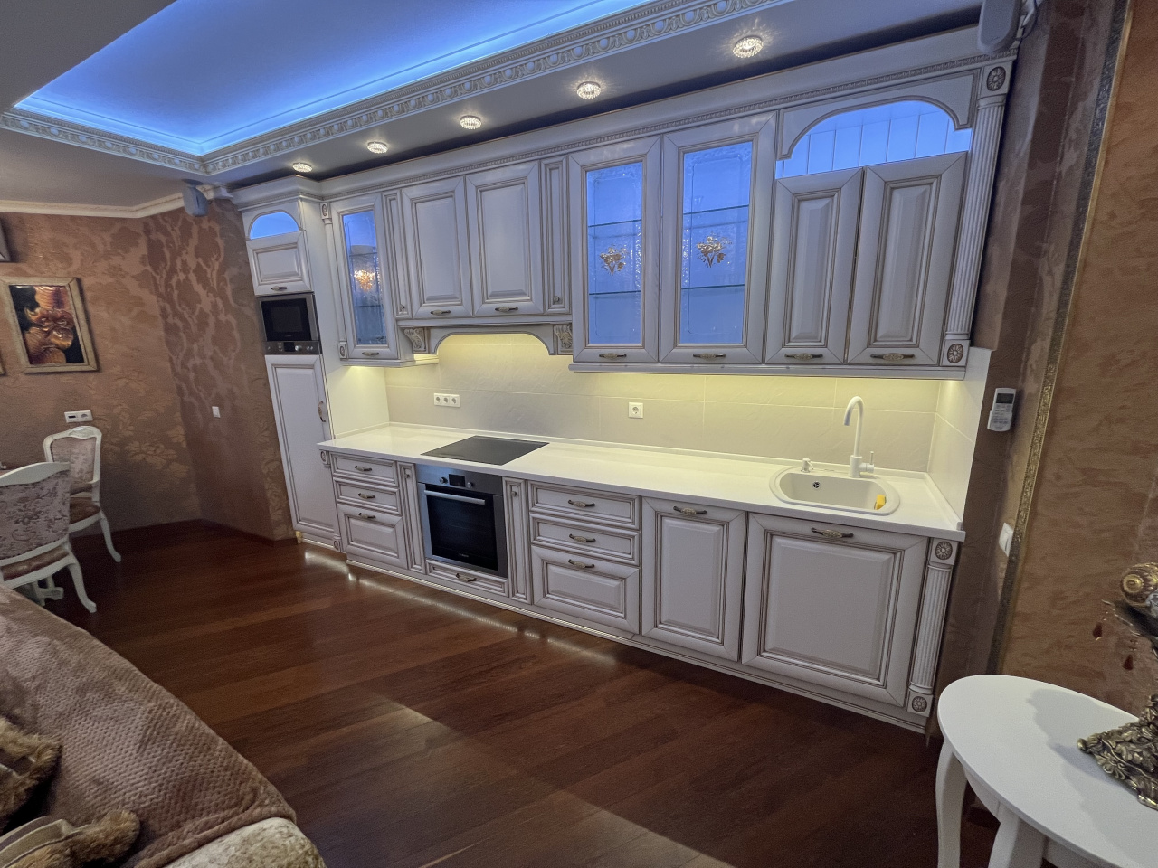 Зал совмещен с кухней, спальня отдельно. Делали для себя. В квартире сделан ремонт из дорогих материалов. Вся мебель из натурального дерева, подогревы полов, кондиционирование. Гардеробная комната. Сушка для белья, посудомойка.