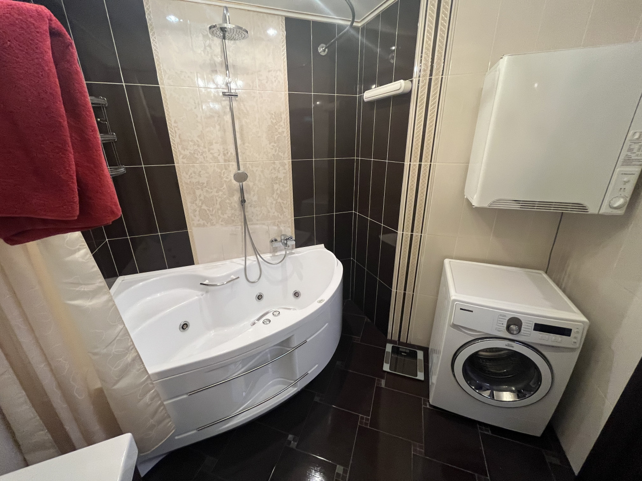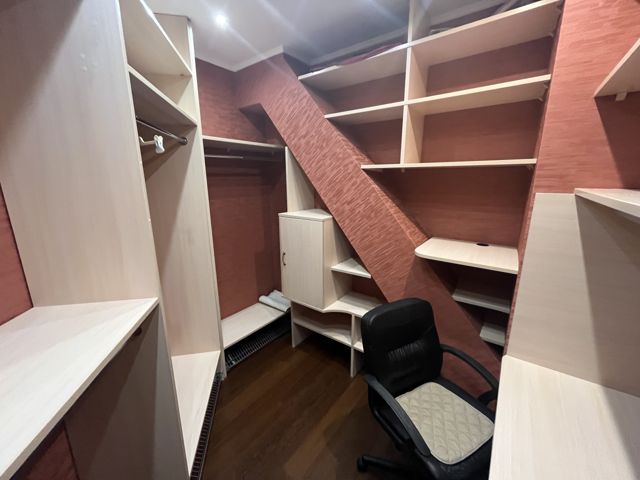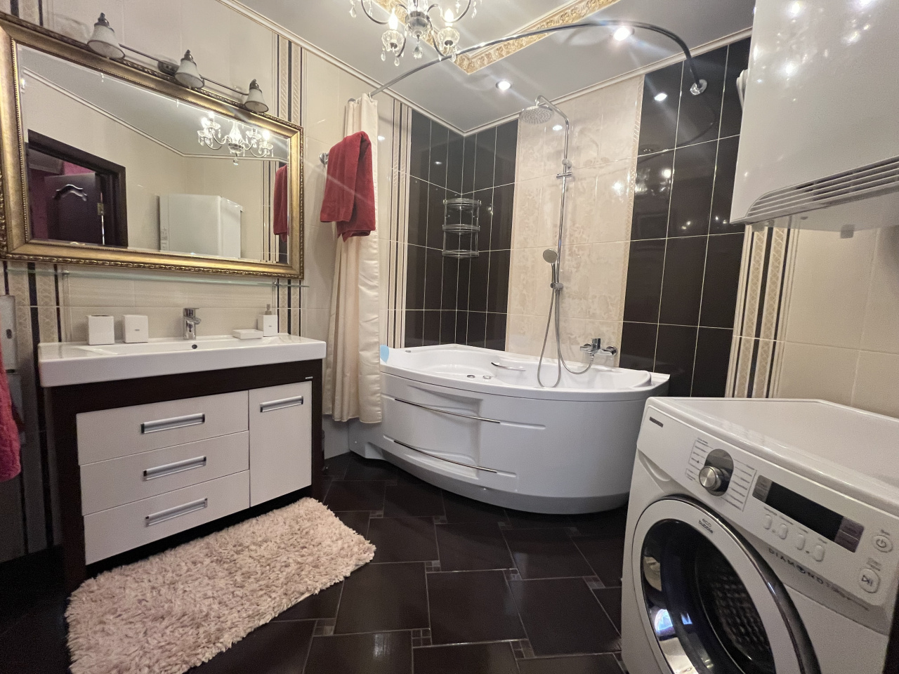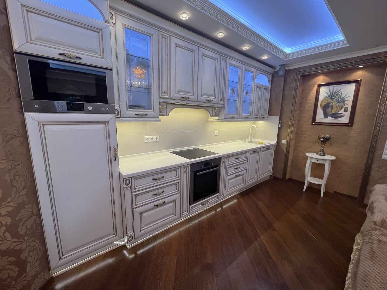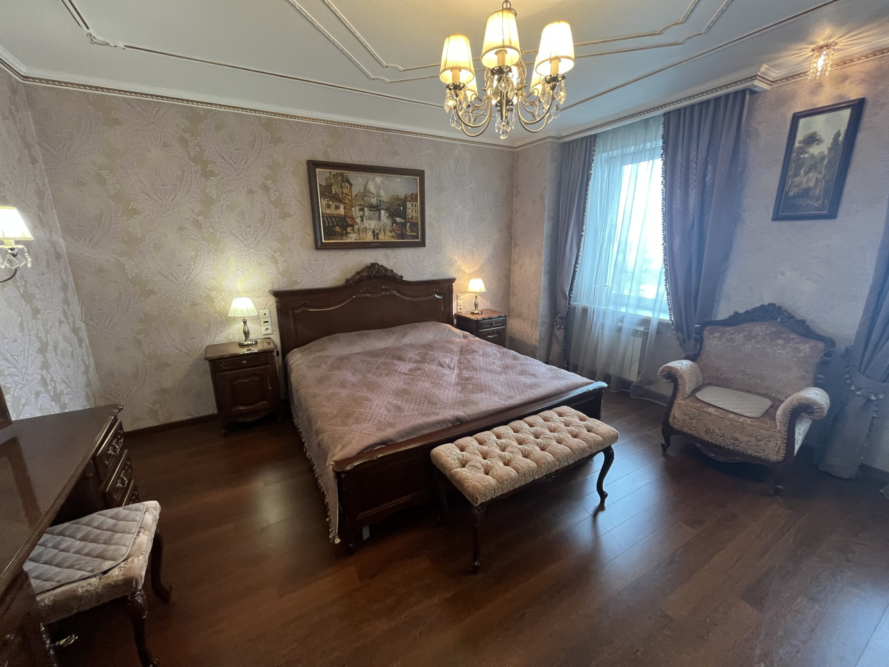 Зал совмещен с кухней, спальня отдельно. Делали для себя. В квартире сделан ремонт из дорогих материалов. Вся мебель из натурального дерева, подогревы полов, кондиционирование. Гардеробная комната. Сушка для белья, посудомойка.